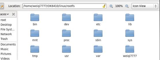 首先创建一个目录,rootfs作为根目录,然后在该目录下,创建必须的文件以及子文件。这里,我多创建了weiqi7777文件夹。