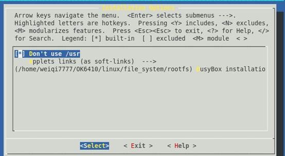 将第一个选中选上,表示编译出来的二进制执行文件不要放在/usr目录下,在第二个选项,填入我们创建的根文件的目录,这样,编译出来的二进制执行文件就在我们创建的根文件下的了。