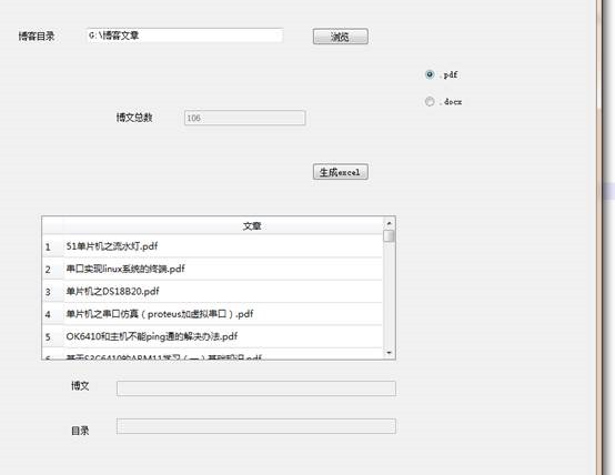 函数实现也比较简单,调用seek_file.py中的两个函数,得到博文的列表和字典。然后将列表中的数据给写到表格中。同时将博文的总数写到博文总数后面的显示框中。运行效果就是以下截图,发现,至今已经写了106篇博文了。