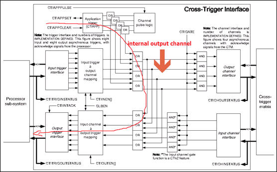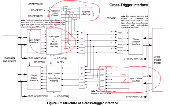 CTI左边连接CPU,有2个通道,一个是接收CPU发送的input trigger,一个是发送给CPU的output trigger。