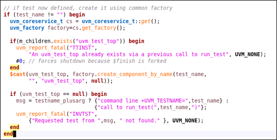 根据test_name,调用工厂函数create_component_by_name,创建testcase的实例,并且赋值给uvm_test_top,因此对于UVM环境,顶层的testcase,将来都会变成uvm_test_top。