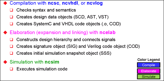使用ncvlog(ncsc,ncvhdl),ncelab,ncsim命令来实现仿真。