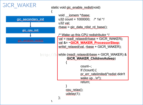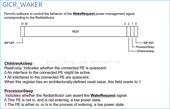 当gic要唤醒cpu interface和PE时,也是操作这个 GICR_WAKER寄存器。