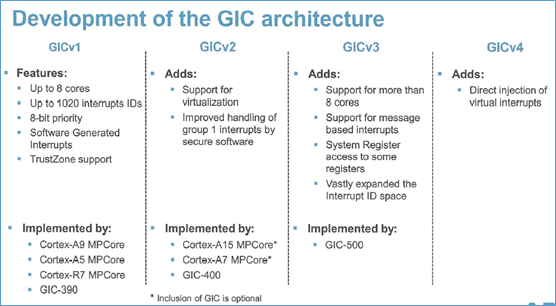 GIC,是arm为了实现复杂的中断控制,而定义的一套架构。版本也历经了多个变化,从最初的GICv1到现在最新的GICv4。每一个新的版本,都增加了一些新的功能。