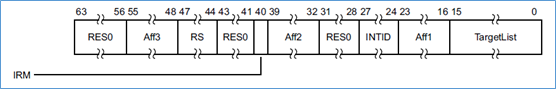 例如,IRM为0,INTID为1,Aff3.Aff2.Aff1为0.0.0,TargetList为0xf,RS为0,就表示,软中断发送给属性层次为0.0.0.[0-3]的cpu。