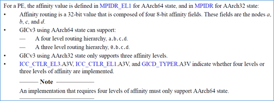 gic3中,使用属性层次,来对CPU进行标识,这样可以精确的将中断发送指定的cpu。属性层次最高有4层,为aff3.aff2.aff1.aff0。每一个属性层次,用8bit来表示。如下图所示: