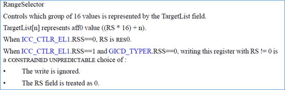 这个时候range selector就派上用场了,RS域共4个bit,可以表示16个范围,16x16=256,刚好表示256个cpu。所以spec里面,说TargetList[n]表示的aff0的值为RS*16 + n。
