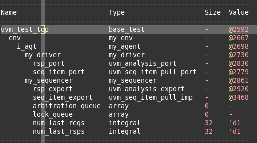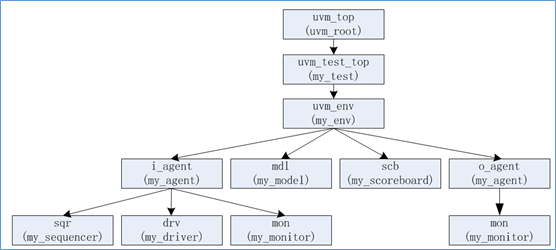通过uvm_top.print_topology()函数,可以打印uvm的拓扑结构。比如如下我的一个uvm环境,打印的拓扑结构如下: