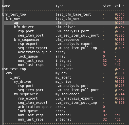 从打印可以看出,此时UVM环境,有2个uvm test顶层,每个顶层下面有自己的uvm环境。