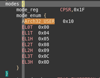 mode_enum:对cpu的mode的枚举描述,第一列是cpu的模式,第二列是对应寄存器的值,也就是 CPSR & 0x1f的值。