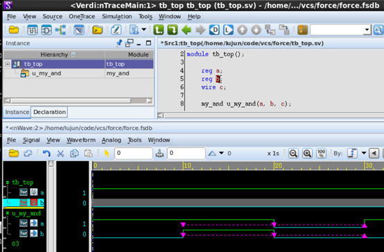 initial begin a = 1; b = 0; #10; force u_my_and.a = 1'b1; force u_my_and.b = 1'b1; #10; force u_my_and.a = 1'b0; force u_my_and.b = 1'b0; #10; release u_my_and.a; release u_my_and.b; #10; $finish(); end