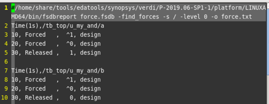 此时,我们可以使用fsdbreport命令,从波形里面,把所有的信号force的信息,全部给抓出来,保存在一个文件中,这样,我们通过该文件,就可以知道仿真过程中的所有信号force信息。