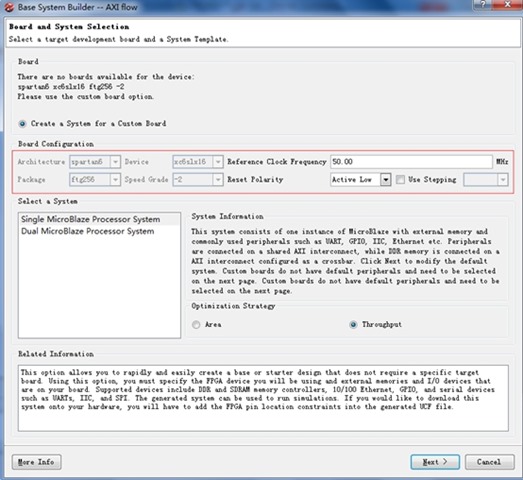 Step6:进行如下设置选择单核处理器,和系统时钟50MHZ 因为MiS603输入时钟是50MHZ