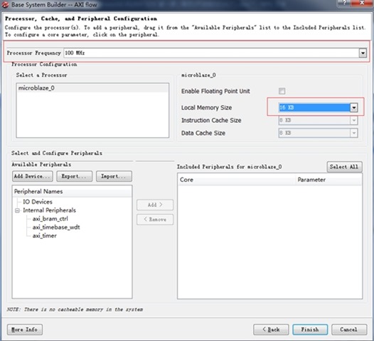 Step7:设置CPU时钟100MHZ ,本地内存是16KB ,读者注意开发板输入时钟是50MHZ为什么系统时钟是100MHZ呢?