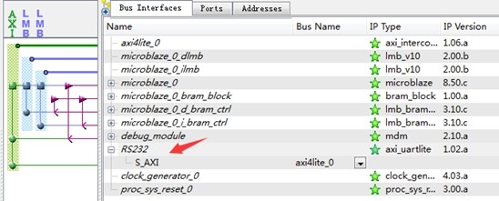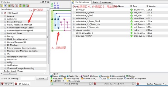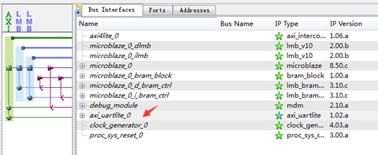 Step8:此界面下第一简图是可以添加到总线的IP-CORE 弟二个箭头是总线类型。 Bus Interface 是总线接口,添加IP-CORE后都会在这边显示出来。Ports 是接口,添加的IP-CORE 或者外设接口都在这个界面中。