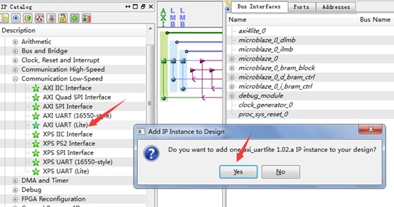 Step1:添加串口IP-CORE AXI UART(Lite)之后单击YES