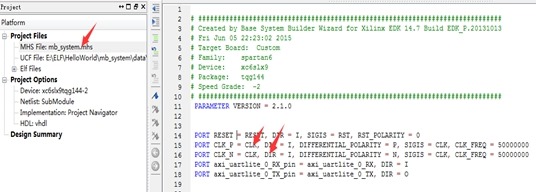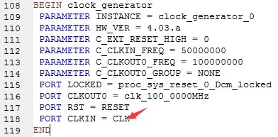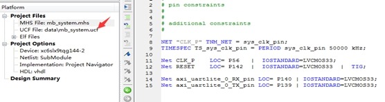 Step1:由于MiS603开发板采用了单时钟输入,而默认是差分时钟输入,所以需要修改时钟,打开MHS文件修改箭头指示位置
