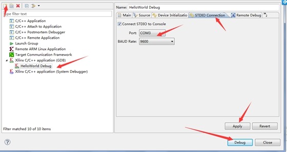 Step4:新建一个测试文件,配置串口波特率9600 单击Apply 再单击 Debug