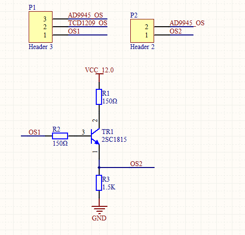 此部分的datasheet提供了参考电路。TCD1209个人认为可直接利用提供的参考电路。从pin1出来的TCD1209_OS为模拟信号,电压值范围应该为4.0V~7.0V之间。将此信号与AD9945耦合,利用AD9945采集TCD1209的信号。但是耦合方式设计为两种方式:1.直接通过0.1uF电容进行耦合;2.通过三级管,利用射极跟随器做缓冲,之后再经过0.1uF电容和AD9945进行耦合。实际板级电路中,同时预留了这两种方式,在后期调试综合比较哪种方式使输出信号更为理想。