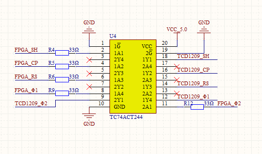 TCD1209的TCD1209_SH、TCD1209_CP、TCD1209_RS等都需要5V脉冲电压控制,而FPGA的IO口只有3.3V。为此,需要进行相应的电平转换。选用SN74LVC4245A或TC74ACT244进行电平转换。