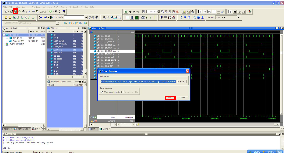 在波形图界面单击下,再点击保存,可以将仿真完成的波形图保存下来,以便下次启动时直接查看。保存的文件依然为.do文件。