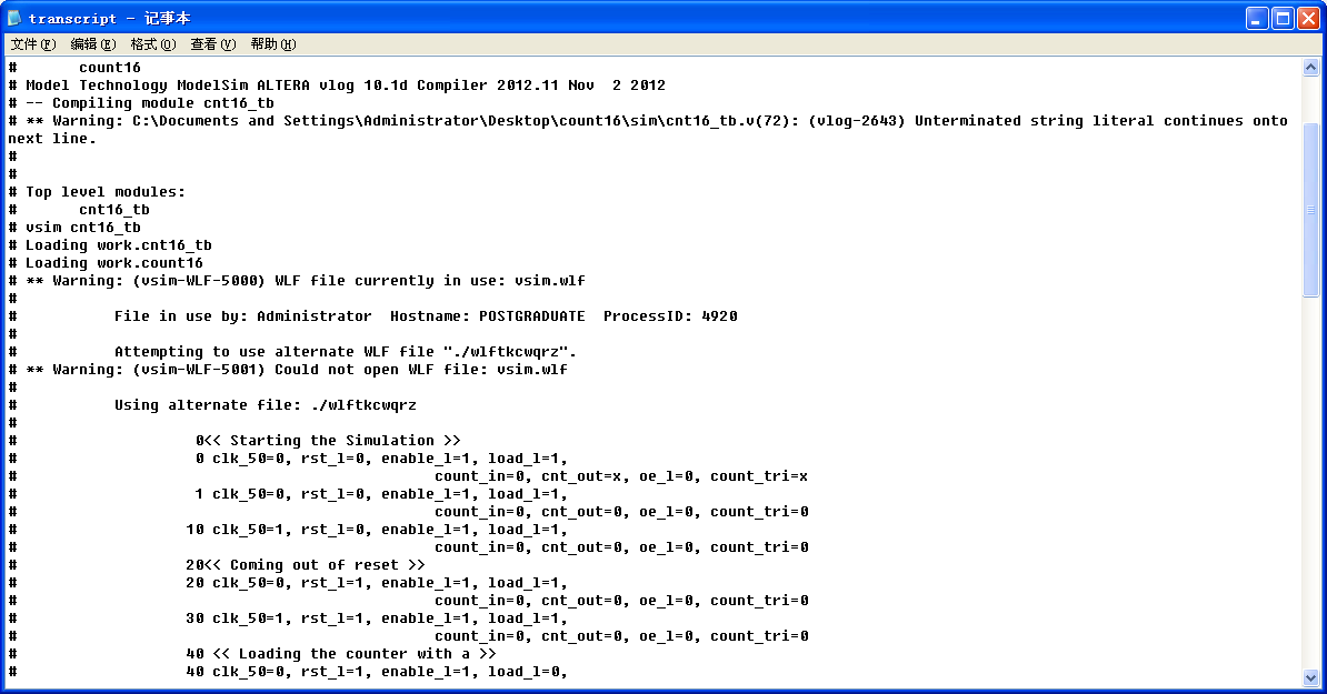 仿真的结果也可通过生成的transcript文件来查看,采用txt文本文档打开。