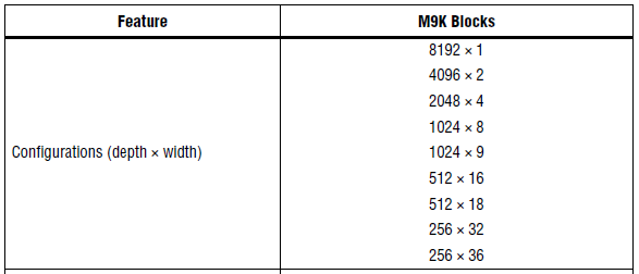 由上图可以看出FPGA虽然内部拥有一定数量的M9K,但配置深度和配置位宽均有一定的限制。