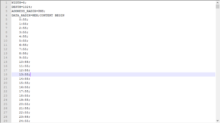 思路是有了,接下来看看一个可供quartusII识别的.mif文件内部是什么结构。此时以txt文档打开一个简单配置完成的文件来看看。