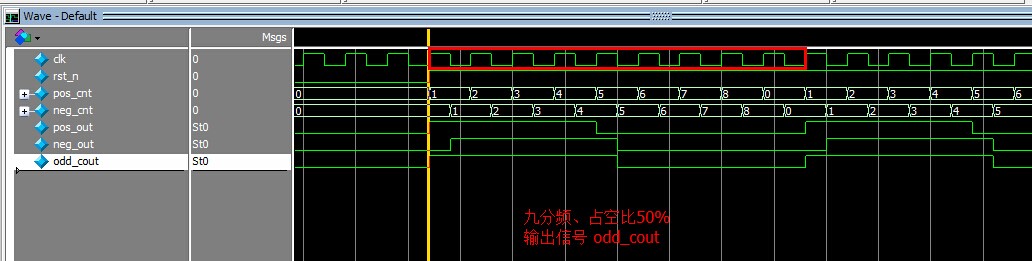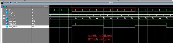 `timescale 1ns/1ns module Odd_count(rst_n,clk,odd_cout,pos_cnt,neg_cnt,pos_out,neg_out); input clk; input rst_n; output odd_cout; output [3:0] pos_cnt; output [3:0] neg_cnt; output pos_out; output neg_out; reg [3:0] pos_cnt; reg [3:0] neg_cnt; reg pos_out; reg neg_out; always@(posedge clk) begin if(!rst_n) pos_cnt<=4'd0; else if(pos_cnt==4'd8) pos_cnt<=4'd0; else pos_cnt<=pos_cnt+1'b1; end always@(posedge clk) begin if(!rst_n) pos_out<=1'b0; else if(pos_cnt<4'd4) pos_out<=1'b1; else pos_out<=1'b0; end always@(negedge clk) if(!rst_n) neg_cnt<=4'd0; else if(neg_cnt==4'd8) neg_cnt<=4'd0; else neg_cnt<=neg_cnt+1'b1; always@(negedge clk) if(!rst_n) neg_out<=1'b0; else if(neg_cnt<4'd4) neg_out<=1'b1; else neg_out<=1'b0; assign odd_cout=pos_out|neg_out; endmodule仿真图如下所示: