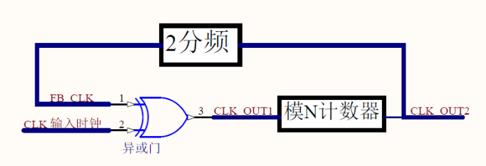 该分频器设计方法:设计一个模3计数器,再设计一个脉冲扣除电路,每来3个时钟周期时,扣除半个周期,即可实现分频系数为2.5的半整数分频。采用类似方法,可实现任意半整数的分频器。如下图所示,采用异或门和2分频模块设计出脉冲扣除电路,脉冲扣除是输入频率和2分频输出相异或的结果。