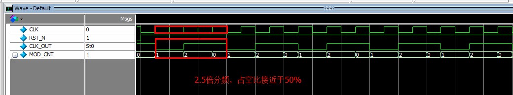 当然,改方法得到的脉冲信号并非占空比为50%的,但可以增加两行代码来近似做占空比为50%的周期信号。如下代码中,2.5倍分频结果,输出CLK_OUT2。再通过或逻辑得到近似占空比为50%的CLK_OUT。