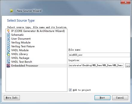 ◎添加New Source,选择Embedded Processor,命名为mis603_soc。这里之所以选择新建个新的程序,而不是使用第一章的例子在里面添加组件,主要是添加DDR3所需要的组件和之间的互联非常复杂。所以推荐大家新建个程序,直接让工具帮我们添加好所需的组件。