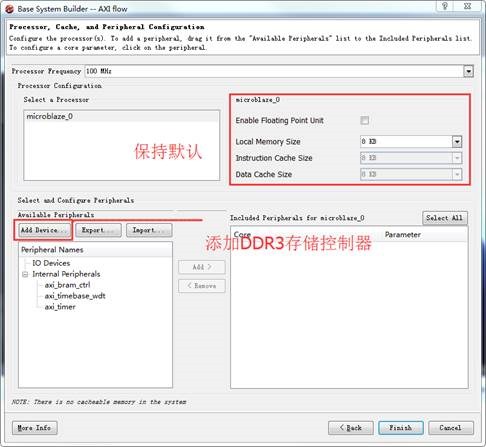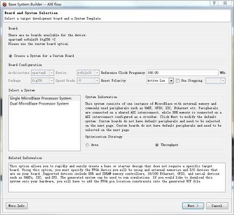 ◎弹出Base System Builder—AXI flow对话框,保持处理时钟100Mhz不变,直接进入Next,默认即可。