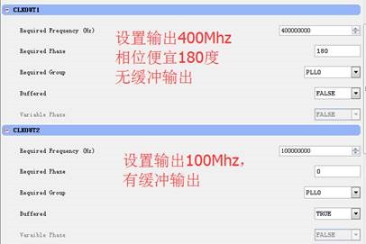 ◎修改clock_generator_0组件,设置输入时钟50Mhz,CLKOUT0为400Mhz,CLKOUT1为400Mhz,CLKOUT2为100Mhz。具体配置如下图所示。