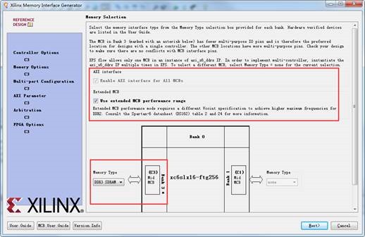 ◎双击DDR3组件,开始配置MCB控制器。在弹出的配置界面中,按下图所选。选择Bank3的控制器。