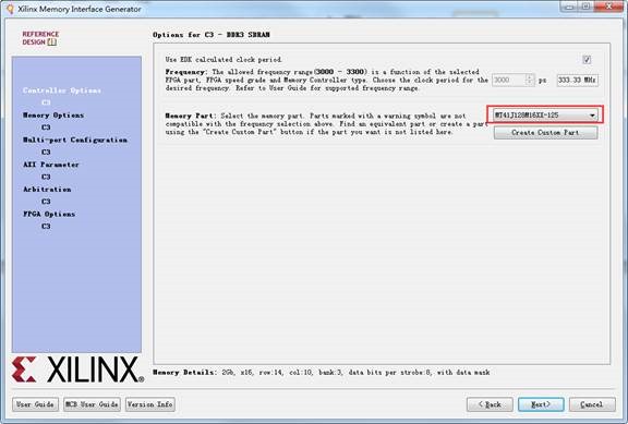 ◎点击Next,这时候选择对应的DDR3 SDRAM的型号。工作时钟保持333.33Mhz不变。