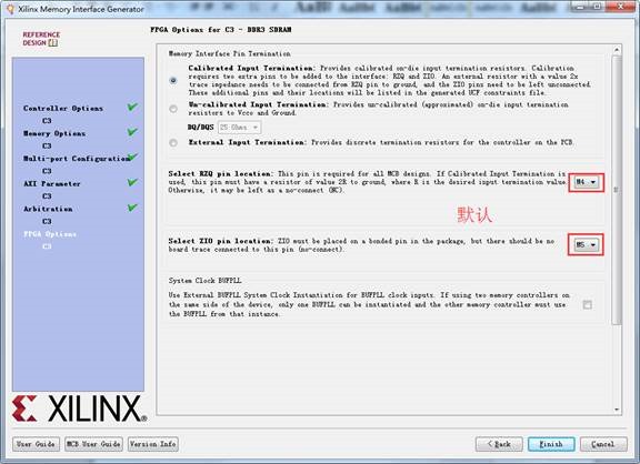 ◎继续配置下去,进入到设置终端电阻。其中RZQ pin和ZIO pin为PCB布线中所选择的,幸运的是mis603与该默认保持一致。点击Finish,即完成DDR3控制器添加。