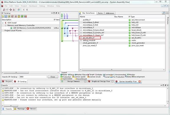 ◎这时候XPS窗口中可以看到所添加的DDR3 MCB。这里面还包括AXI4总线,连接外设与MB系统总线。还可以看到clock_generator_0已经添加的多个CLKOUT。具体系统与外设直接的总线互联请大家详细看这里面。