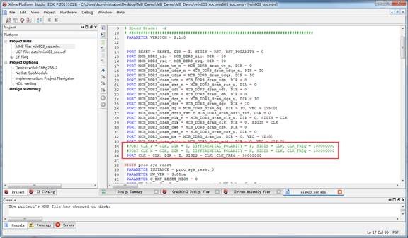 ◎打开MHS File,这时候可以看到工具已经为我们添加好硬件信息。但是需要注意修改差分时钟为单端时钟。