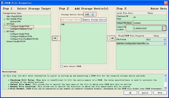 进入界面,选择SPI Flash 点击向右箭头,进入step 2,选择64M device 并且add,进入第三步,设置好输出的目录。