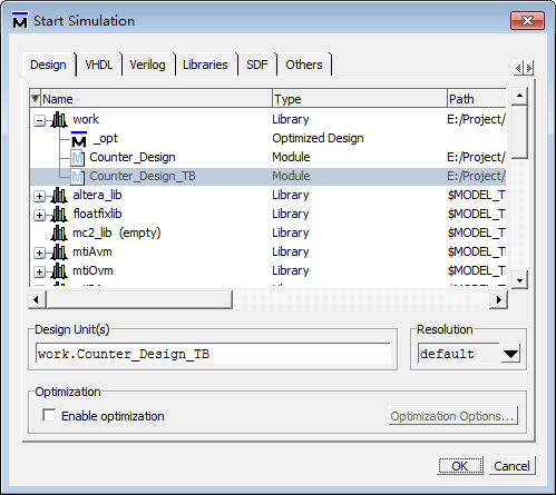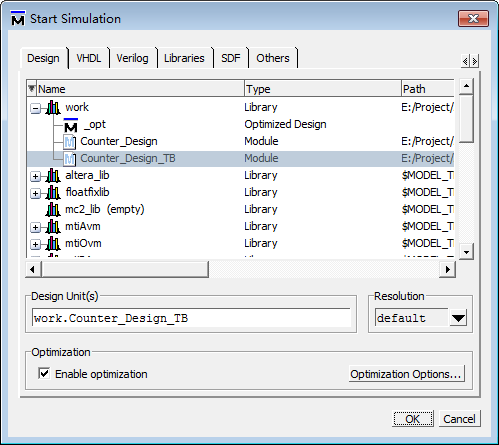 按照CB的步骤是没有什么问题的,但是就是在测试模块下面没有信号列表,仿真更别谈有波形了,无意中发现不应该勾选Enable Optimization
