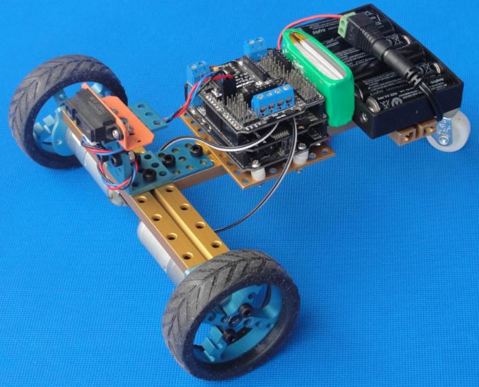 值得注意的是,如果L298驱动板和Arduino控制器共用同一个电源,那么这个电源的质量和功率的要求更高,由于两台电机都是耗电元件,所以运行时电流消耗较大,电源功率不够,会导致电源电压下降,致使电压达不到Arduino控制器的5V供电要求,程序运行有时不正常。于是我往往把逻辑部分和电机驱动部分分别供电,所以可以看到下图,有两套电源,一套电源是7.4V锂聚合物电池,给Arduino控制器供电,另一套电源是6节三洋充电电池专门为电机驱动供电。