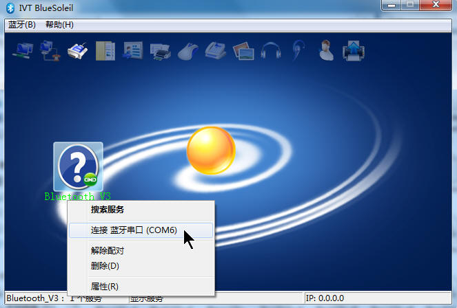 舵机控制板与PC机的通信采用蓝牙模式,在控制板的“16数传接口”上插入蓝牙模块,蓝牙模块也要设置为波特率为115200b/s,并采用从机通信模式。在PC机的USB插座上插入蓝牙适配器,利用了IVT蓝牙管理软件进行上下位机的联机。这次用的笔记本电脑安装了win7操作系统,我发现低版本的IVT蓝牙驱动管理软件,连接失败,采用高版本V6.4版,成功了。操作生成的串口号为COM6。PC机蓝牙管理软件IVT_BlueSoleilv6.4(win7),请下载:http://115.com/file/beuhmkdf。