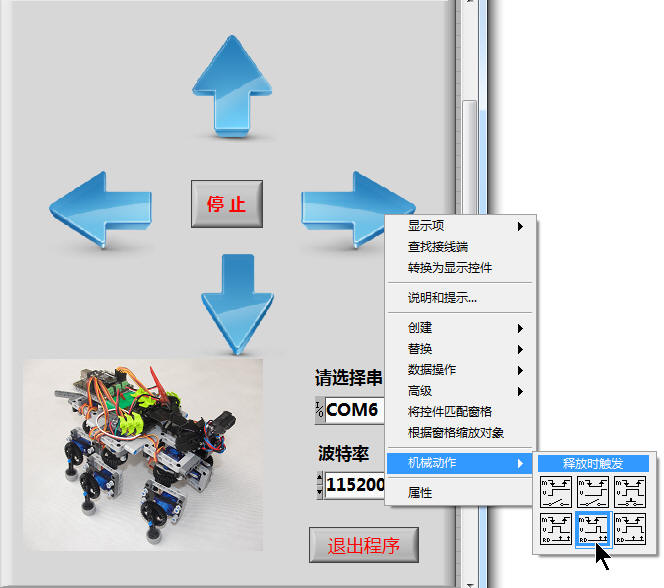 在前面板中,有蓝牙串口号和波特率设置输入栏,有“退出程序”的按钮,还用界面设计的核心控件,前进、后退、左转、右转和停止按钮。这些按钮的“机械动作”,要通过右键快捷菜单,来设置为窄脉冲触发模式,如下图所示。