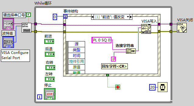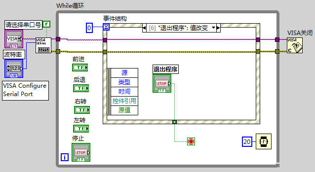 前后左右及停止控件按下时,会立即反馈到后台程序,即LabVIEW框图程序,这个程序会把字符串命令,通过无线串口下达给32路舵机控制板,进而控制机器人12个舵机动作。这次LabVIEW程序编制有两个要点:1、如何把字符串命令通过LabVIEW的VISA串口VI(子函数),写入到舵机控制板的存储卡;2、如何应用“事件结构”工具,把前面板的按钮触发事件与相应的字符串命令下达关联起来。