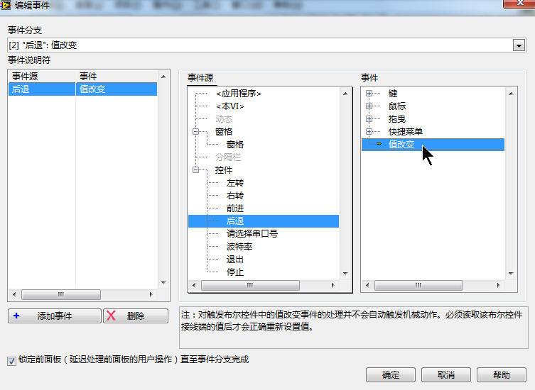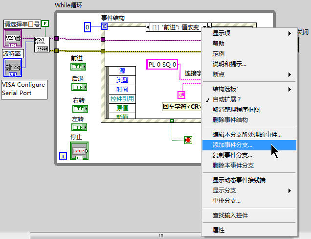 如果希望在“前进”按钮事件后,添加“后退”按钮事件,可以在图10里,找到“后退”事件源,选择事件触发条件是“值改变”。对于前面板中的前进、后退、左转、右转和停止按钮,我分别添加了对应的事件分支帧,在各分支帧里,把相应的字符串命令下达给下位机,32路舵机控制板。