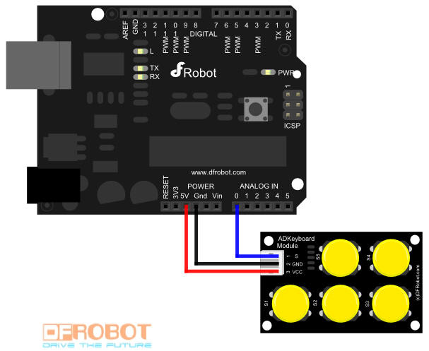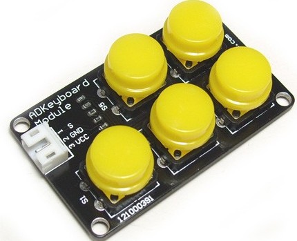 五按钮模块由DFRobot公司出品,这个模块让你使用1路模拟口即可读取5个按键的状态,为Arduino节约IO口。如图2所示。配合Arduino传感器扩展板可以完成使用多个按钮进行互动的作品。