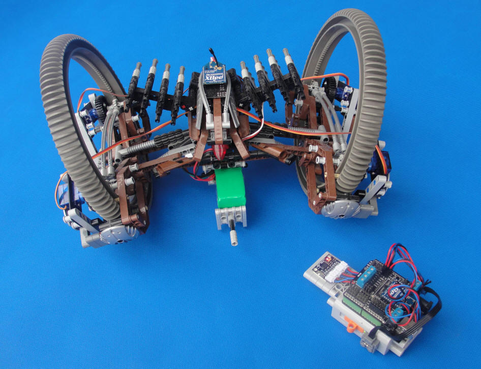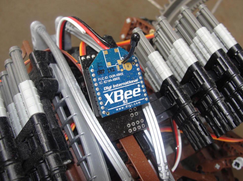 遥控器采用的控制器是Arduino UNO,而乐高星战车采用的控制器是Flyduino,它是一款基于Arduino的微型控制器,尺寸仅用40X24mm,在这样小的电路板上,集成了12个数字端子(舵机控制端子),8个模拟端子,1个XBee无线数传接口。自身仅重7.5g,配上XBee模块也只有15g左右。非常适合嵌入到小型模型中,而不影响模型原本的造型。这次我用Flyduino控制器连接四个mini舵机,它们输出轴上的小齿轮与星战车两边的“巨轮”内齿啮合,使“巨轮”滚动起来,驱动星战车前后左右行驶。