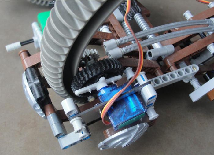 有了专门的舵机连接板,不用任何机械加工,甚至不需要螺钉螺帽连接,仅用乐高积木,按照图4和5所示方法,就可以改造这个4481乐高星战车模型了。(注:4481星战车模型是乐高老型号的产品,国内淘宝应该不容易买到,我是海淘得到。即使您没有这个模型,也可以利用这篇文章提供的思路改造其它产品。)