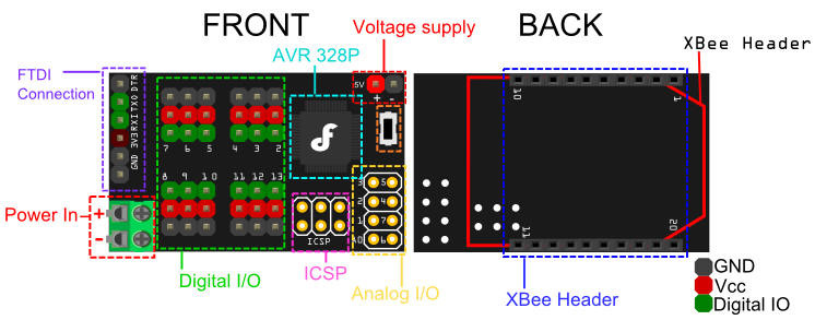 乐高星战车的Arduino控制器是DFRobot公司出品的Flyduino,它比普通Arduino控制器体积小很多,但功能一点也不差。在40X24mm尺寸的电路板正面分布着12个数字端子,8个模拟端子,在电路板背面布置了1个XBee无线数传接口。所以它既具备逻辑运算、舵机控制、传感器信号采集的功能,又具备无线通信的功能。Flyduino电路板布局如图6所示。